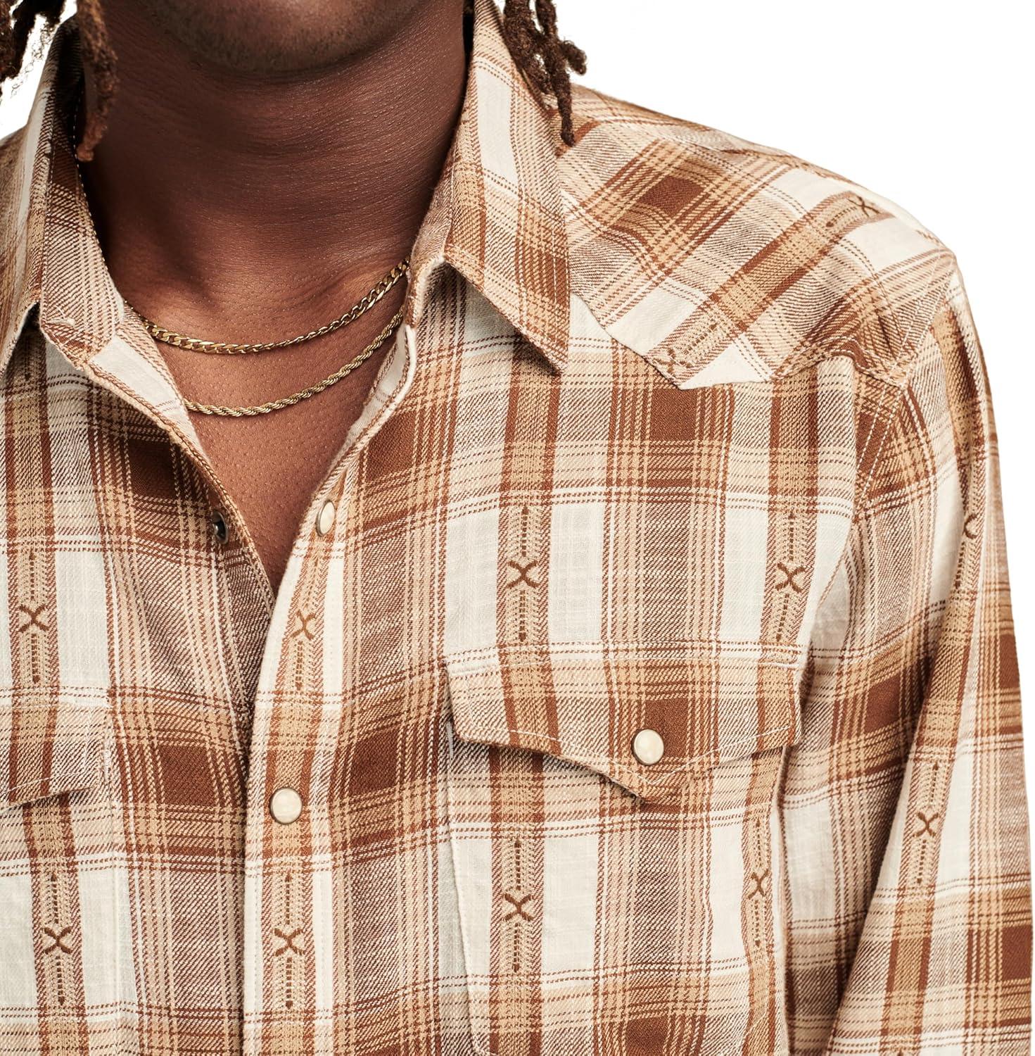 Make an easy wardrobe decision with the Big & Tall Dobby Western Long Sleeve Shirt from Lucky Brand. Cut from one hundred percent dobby cotton fabric, this long sleeve shirt takes inspiration from the west with snap-button styling, double chest pockets and signature pointed yokes at the front and back.