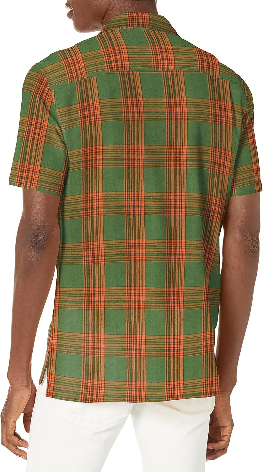 Lucky Brand Mens Short Sleeve Plaid Button Up Auto Shirt(Green Plaid)