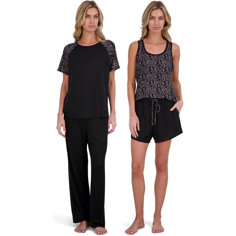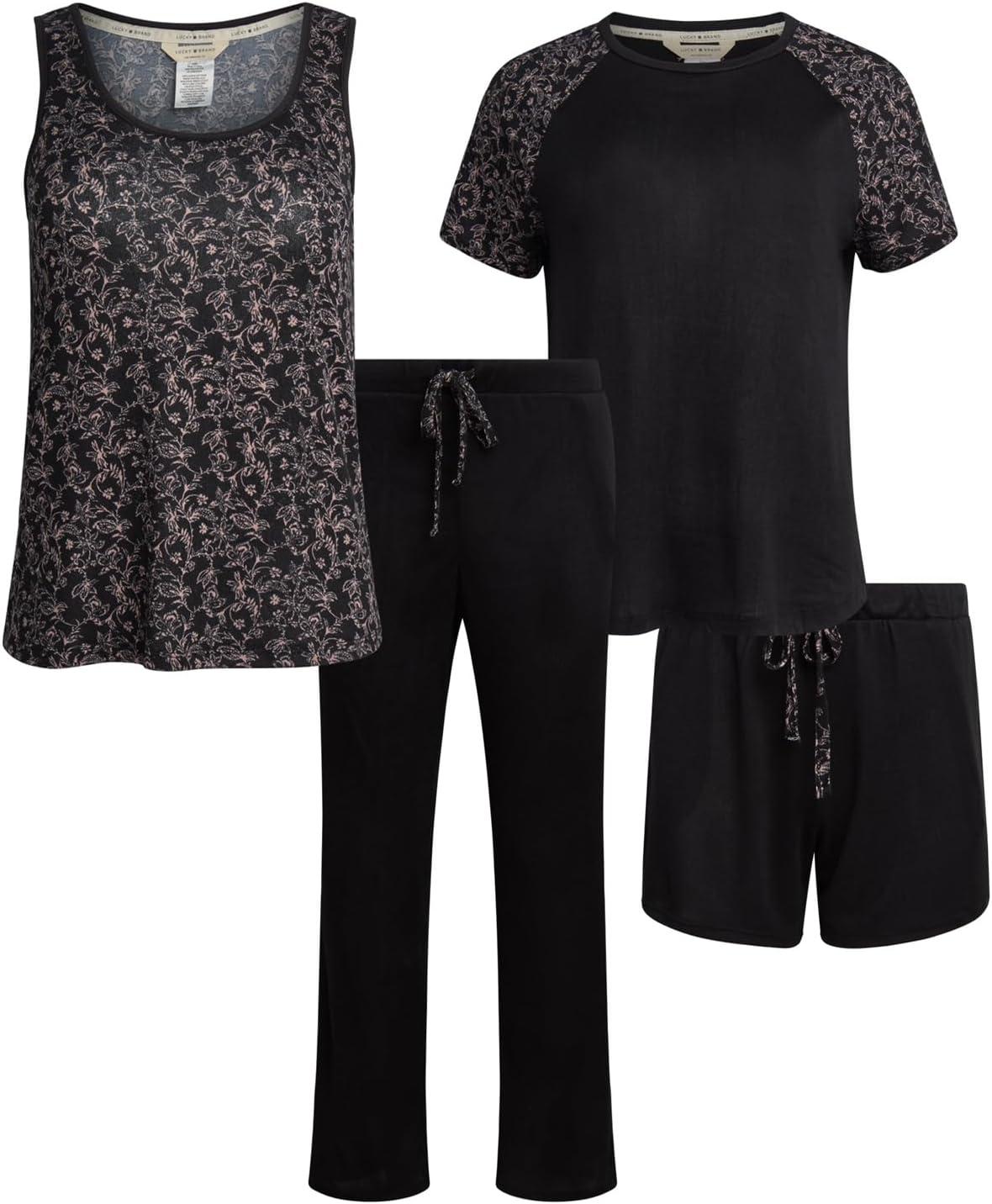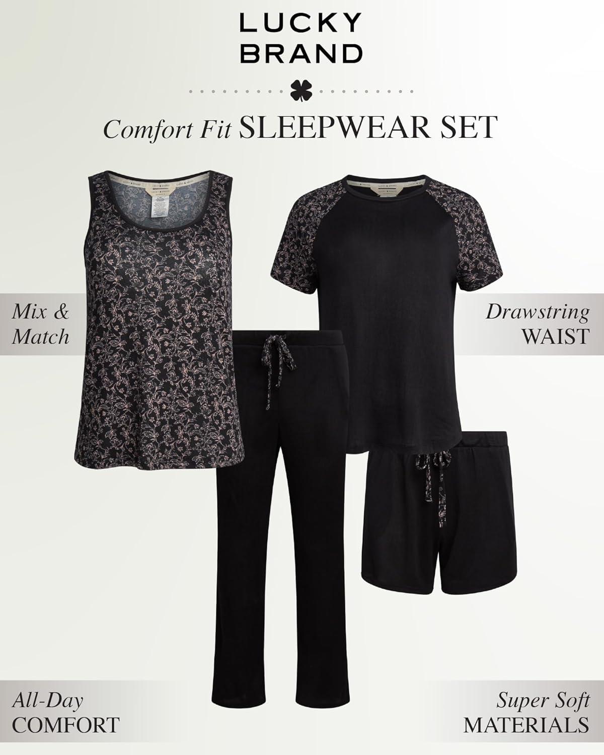Lucky Brand Pajamas Set for Women 4-Piece Soft Sleepwear - Top, Tank, Shorts & Pants, Comfy Loungewear Pijama para Mujer(Black Bandana)