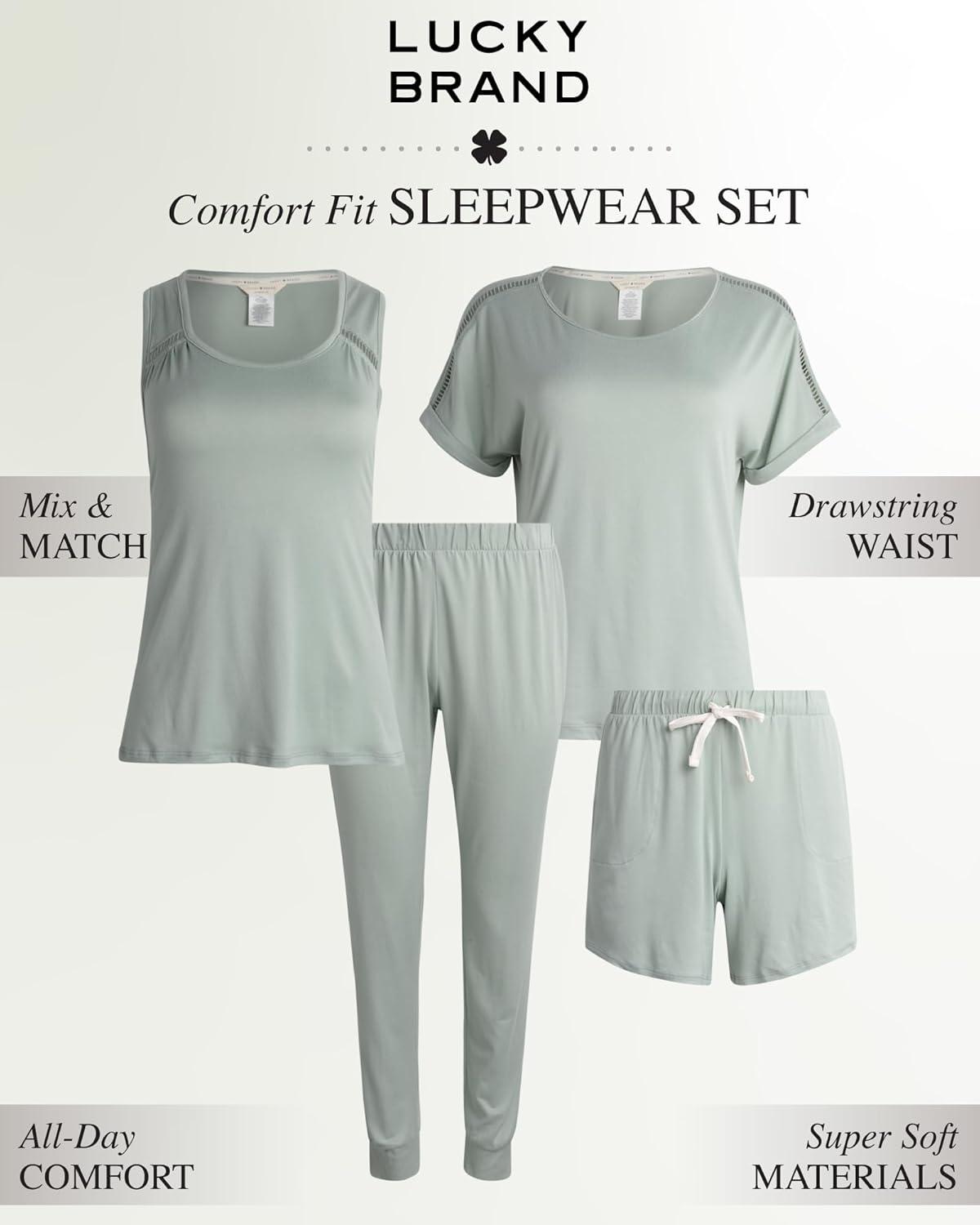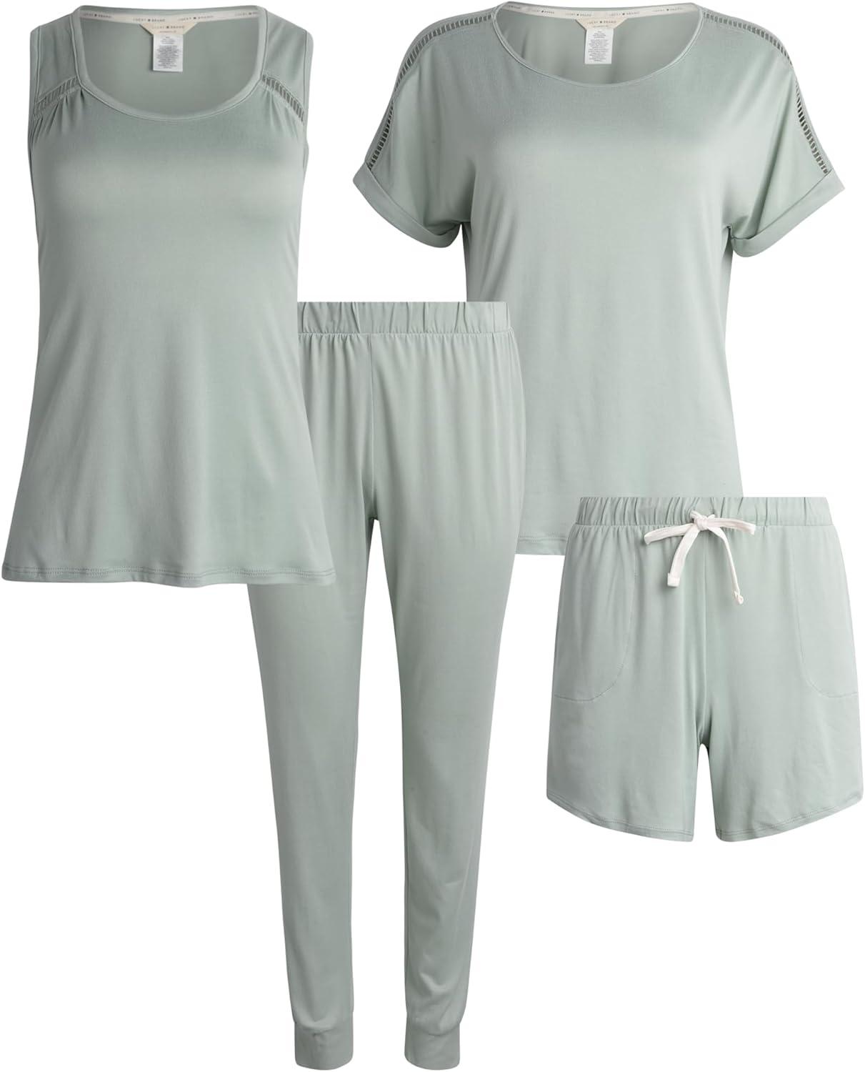Lucky Brand Pajamas Set for Women 4-Piece Soft Sleepwear - Top, Tank, Shorts & Pants, Comfy Loungewear Pijama para Mujer(Soft Sage)