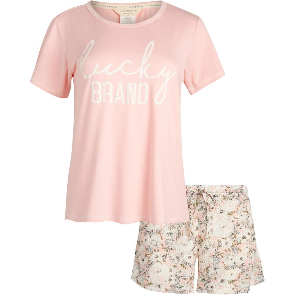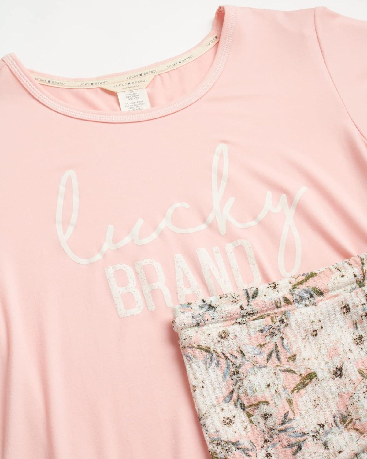 Lucky Brand Women's Pajama Set – Short Sleeve T-Shirt and Waffle Knit Shorts are the perfect addition to your sleepwear collection. The lightweight and breathable fabric will feel amazingly smooth against your skin. Perfect also as loungewear while relaxing at home, you'll love to sleep and chill out wearing this adorable sleepwear set. Breathable and lightweight material of this pajama set will keep you comfortable throughout the night, making it your new favorite PJs. These soft shorts feature an elastic waistband and wide leg openings for extra comfort. Great for warm summer nights, this colorful t-shirt is cool and comfortable. This comfortable and lightweight pajama set comes in a variety of colors, giving you the perfect opportunity to stretch out your nightwear collection. El conjunto de pijama para mujer de Lucky Brand: camiseta de manga corta y pantalones cortos de punto gofre son el complemento perfecto para tu colección de ropa de dormir. Perfecto también para relajarse en casa. Te encantará dormir y relajarte con este adorable conjunto. Su material transpirable y ligero te mantendrá cómodo toda la noche, convirtiéndolo en tu nuevo pijama favorito.