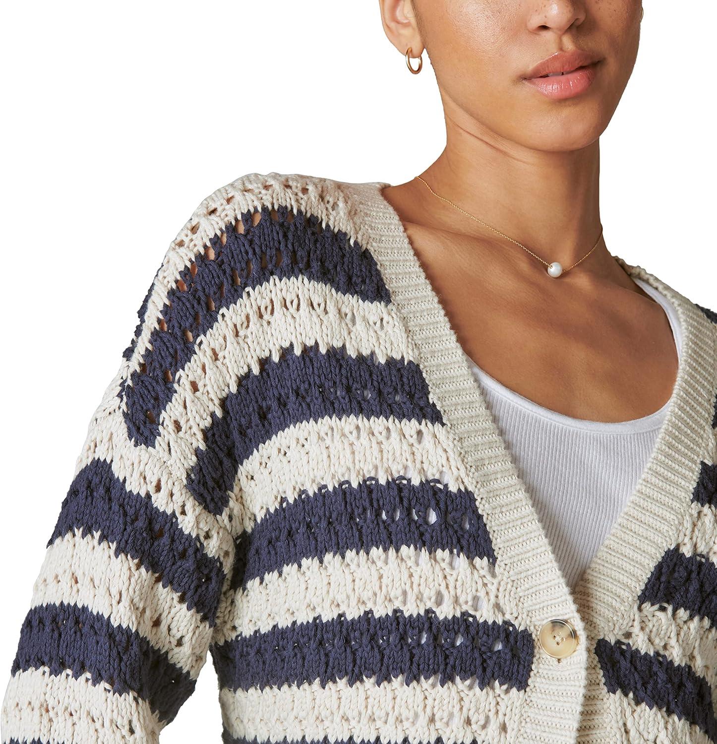 Cozy up to the Button Front Knit Cardigan by Lucky Brand. Spun from a comfy cotton-acrylic fabric, this striped style has an easy button front, ribbed details and cropped silhouette perfect for pairing with high-waisted jeans or shorts. It’s a little bit laidback, a little bit pretty and totally Lucky Brand.