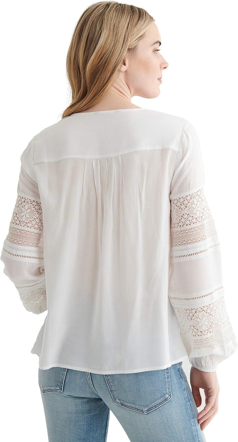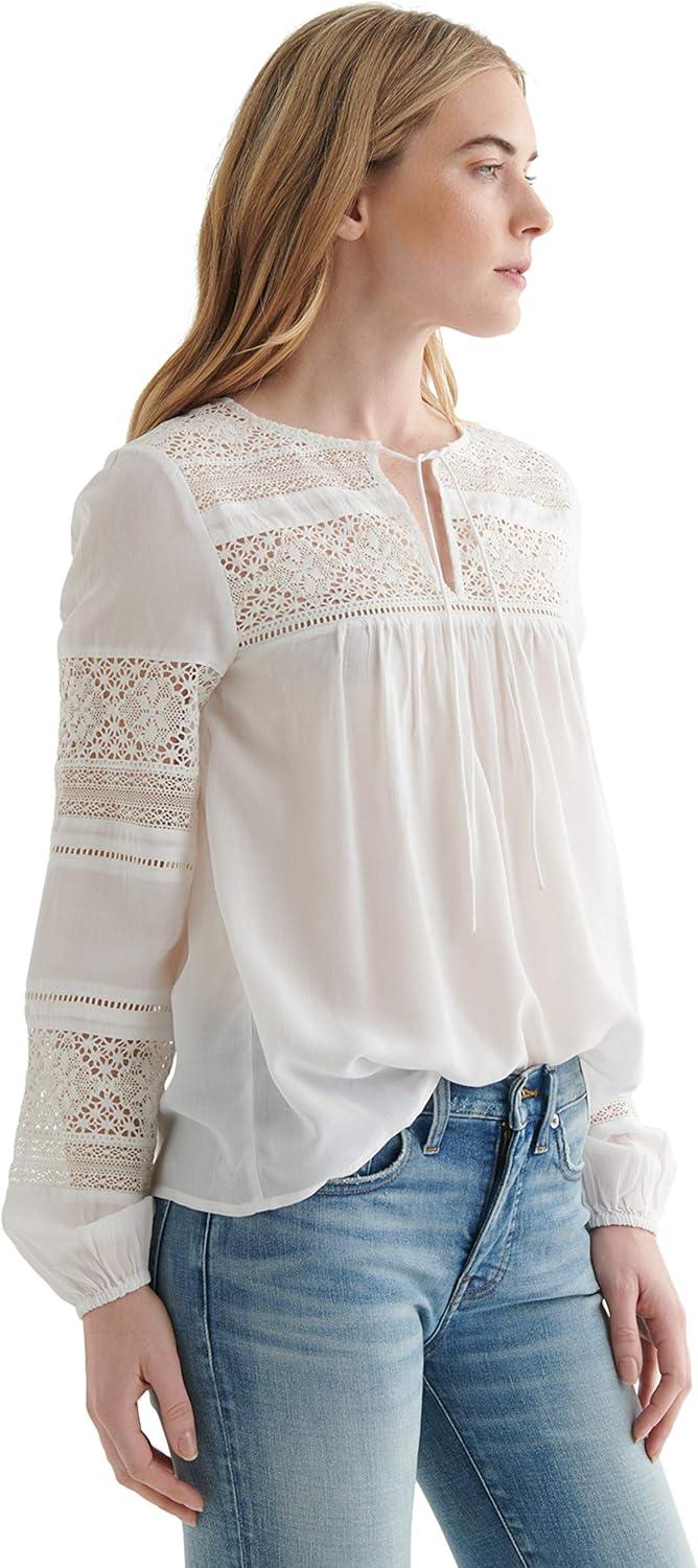 Lucky Brand Women's Long Sleeve Tie Neck Lace Inset Boho Blouse(Bright White)