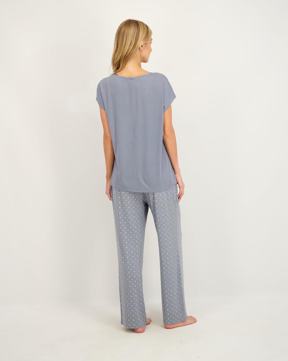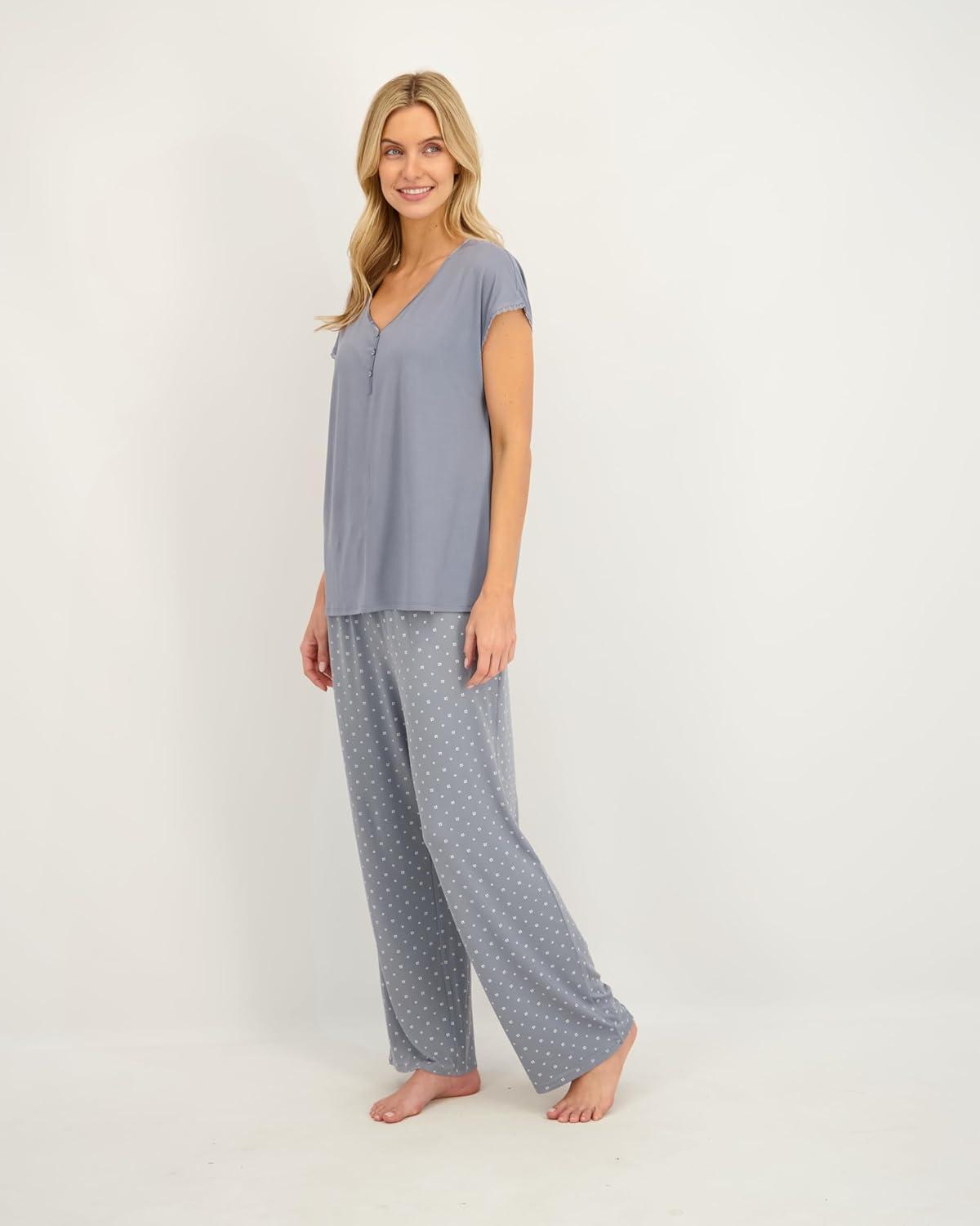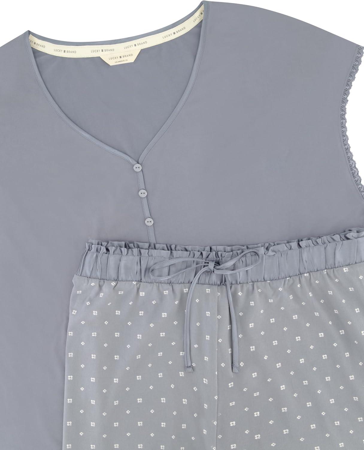 Lucky Brand Women's Pajama Set - 2 Piece Henley Sleep Shirt and Lounge Pants - Silky Soft Sleepwear for Women(Floral Dots/Blue)