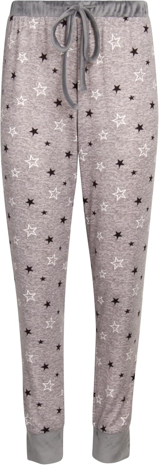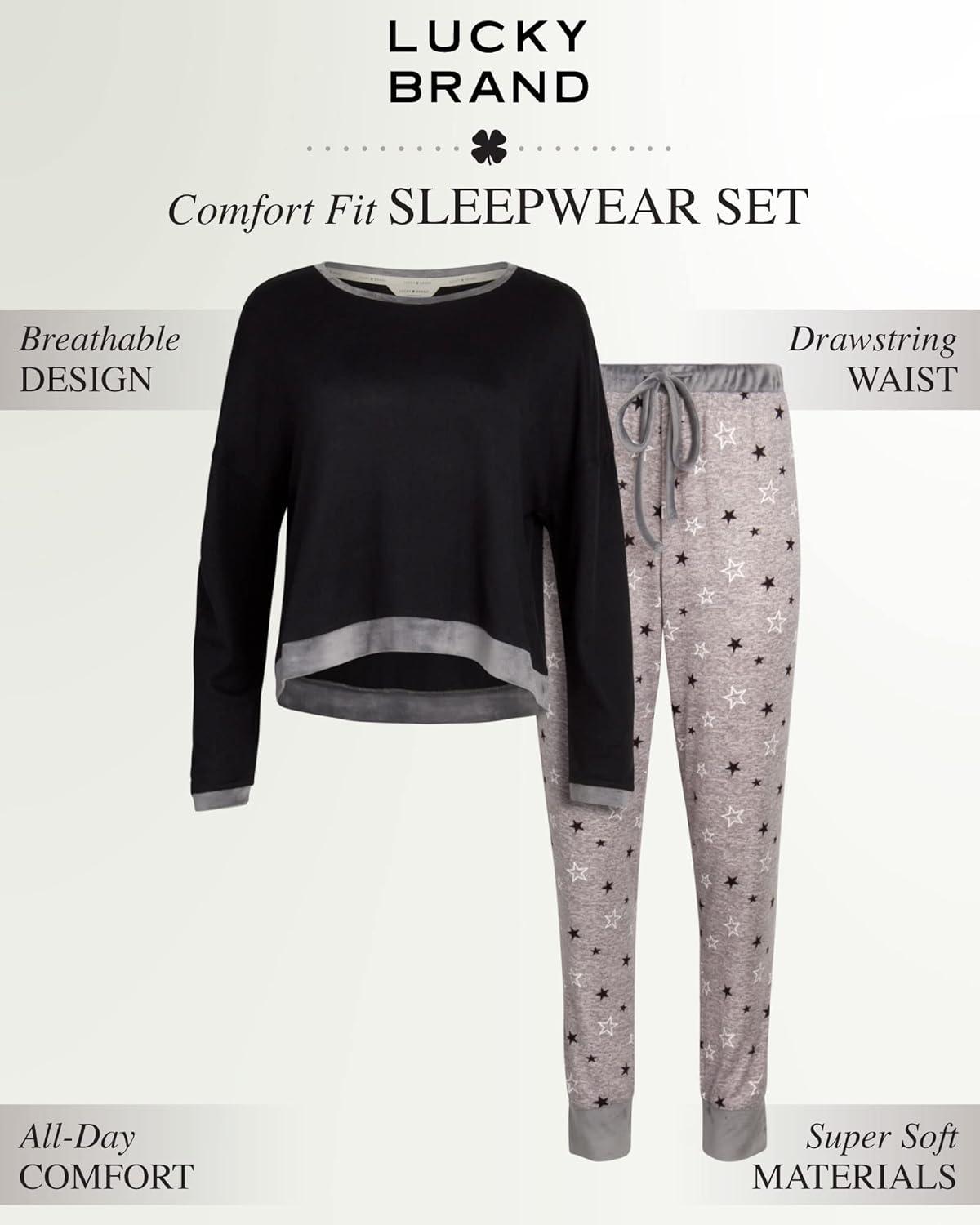 Lucky Brand Women’s Pajama Set – 2 Piece Long Sleeve Sleep Shirt and Jogger Pants with Velour Trim (S-XL)(Black/Stars)