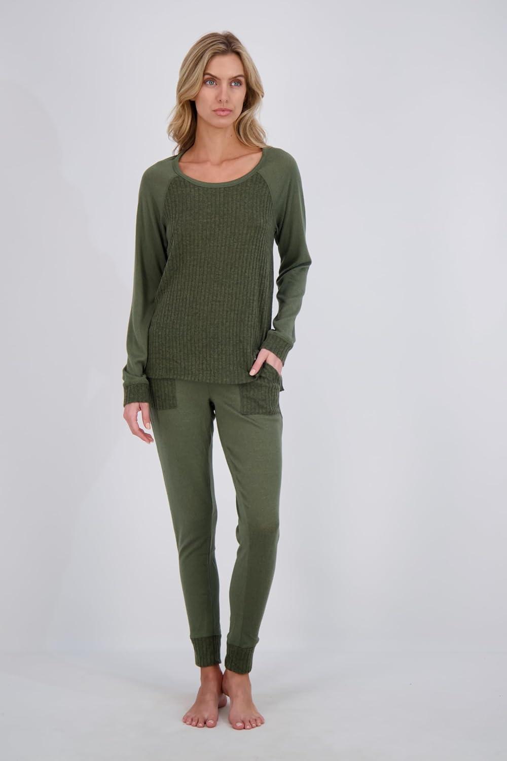 Lucky Brand Women’s Pajama Set – 2 Piece Ribbed Hacci Long Sleeve and Joggers Sleepwear(Beetle Green)