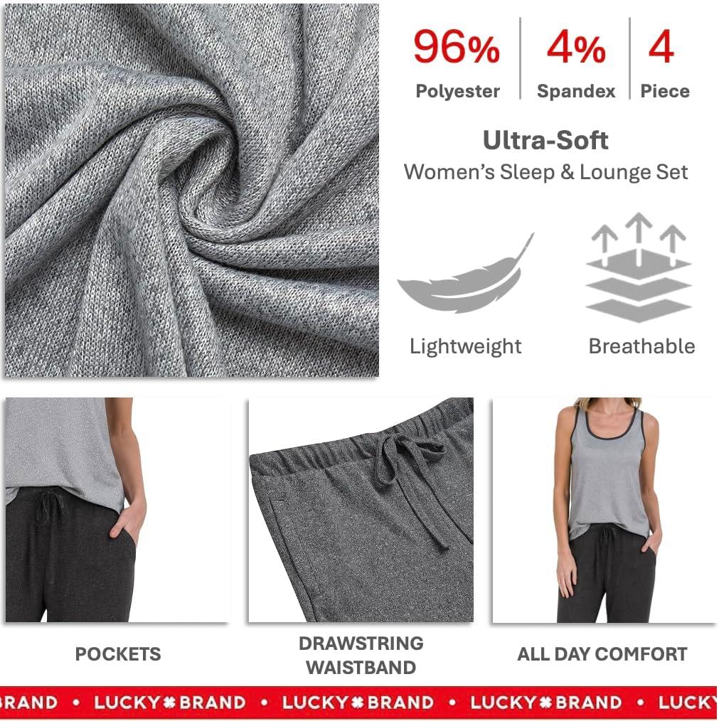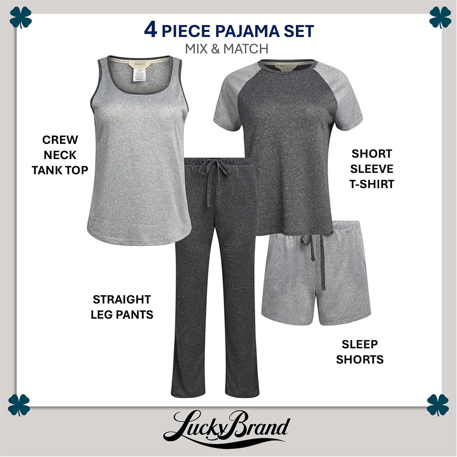 Lucky Brand Women's Pajama Set - 4 Piece Sleep Shirt, Tank Top, Pajama Pants, Lounge Shorts (S-XL)(Heather Grey)